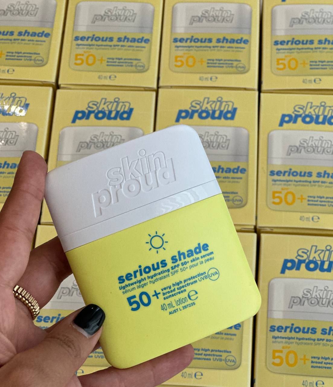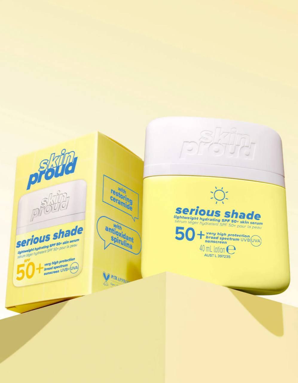 کرم ضد آفتاب Skin Proud Serious Shade SPF 50+ با طیف محافظت گسترده (Broad Spectrum) از پوست شما در برابر هر دو نوع اشعه مضر خورشید یعنی UVA و UVB محافظت میکند. بافت سبک و سرمی آن بهسرعت جذب پوست میشود، بدون اینکه حس سنگینی یا چربی روی صورت باقی بگذارد.
