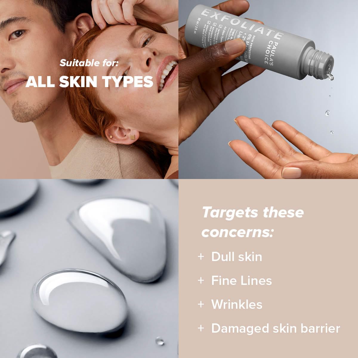 تونر لایهبردار پائولاز چویس با ۶٪ مندلیک و ۲٪ لاکتیک اسید، به روشن شدن پوست، کاهش لک و بهبود بافت پوست کمک میکند.